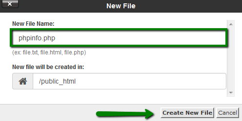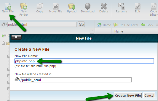 2. به پوشه public_html بروید، روی فایل جدید کلیک کرده و یک فایل phpinfo.php ایجاد کنید: