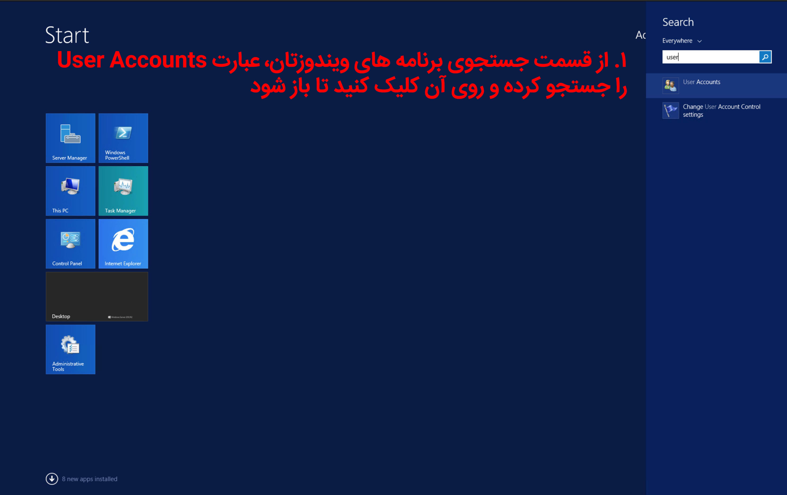 ۱. از قسمت جستجوی برنامه های ویندوزتان، عبارت User Accounts را جستجو کرده و روی آن کلیک کنید تا باز شود