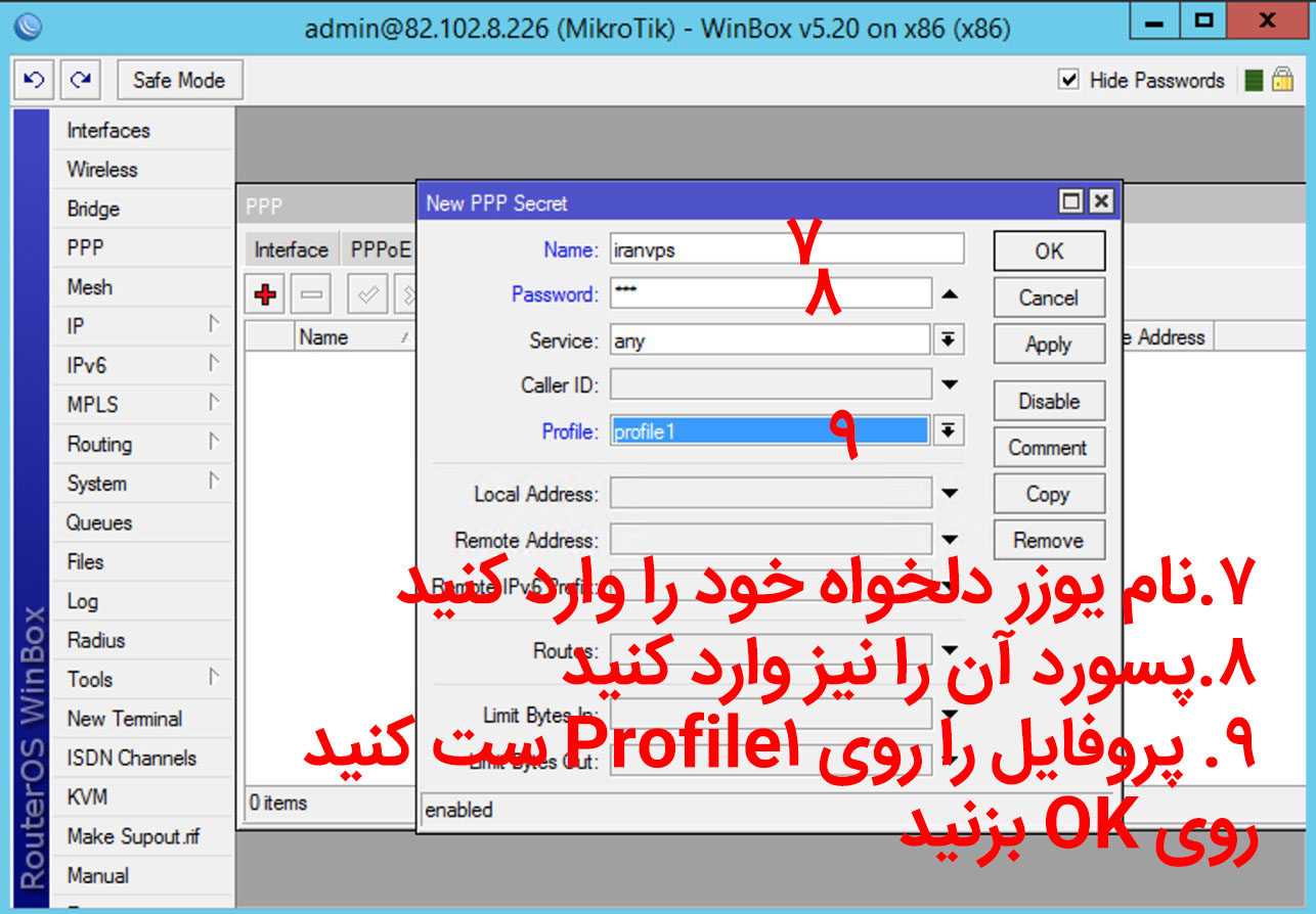 توجه: ابتدا بایستی سرور کانفیگ شود تا بتوانید با ساخت اکانت به سرور خود وصل شوید، در صورتی که آشنایی با کانفیگ کردن میکروتیک ندارید متوانید با بخش پشتیبانی ایران وی پی اس تماس حاصل فرمایید.