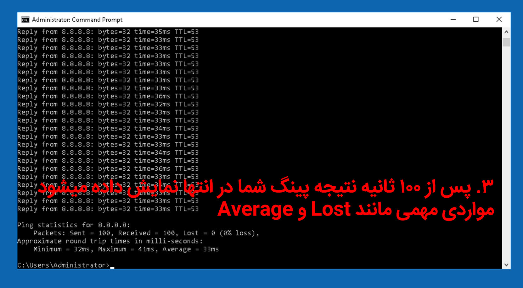 ۳. پس از ۱۰۰ ثانیه نتیجه پینگ شما در انتها نمایش داده میشود مواردی مهمی مانند Lost و Average