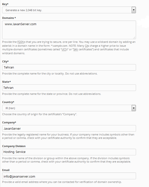 SSL برای آدرس دقیق وارد شده ساخته می شود . در صورتی که میخواهید سفارش WildCard SSL سفارش دهید، نام دامنه خود را با وارد نمودن علامت ستاره و سپس نقطه و بعد نام دامنه