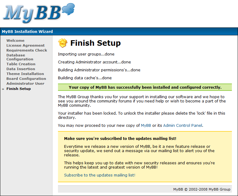 اگر شما واقعا تمایل به قفل کردن دایرکتوری نصب MyBB خود دارید، به آسانی یک فایل تازه در دایرکتوری install با نام lock بسازید، به این ترتیب تا وقتی که این فایل وجود دارد دسترسی به installer/upgrader غیر ممکن دارد .