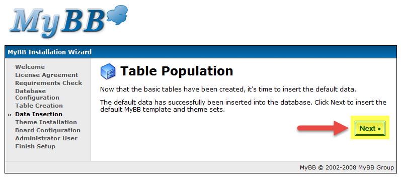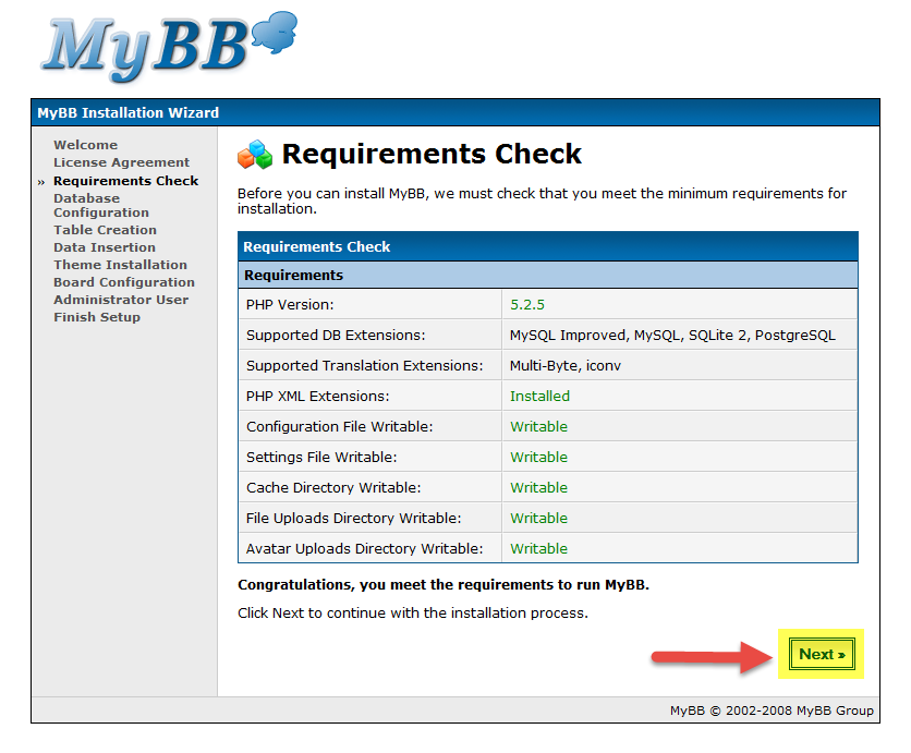 مرحله ششم: این صفحه سرور شما را از جهت دارا بودن نیاز ها برای انجام MyBB بازبینی می کند . چنان چه چنین نباشدف شما در این صفحه مطلع خواهید شد. چنان چه همه چیز به درستی کار نماید ، شما نیاز دارید در این صفحه روی دکمه “Next” کلیک نمایید .
