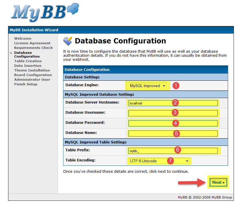 مرحله پنجم: در این صفحه شما پیش از اینکه بتوانید MyBB را نصب کنبد می بایست توافق نامه لیسانس را مطالعه کنید و قبول نمایید . شما در همـه مدتی که انجمن ساز را نصب کرده اید می بایست به موافقت نامه لیسانس پای بند باشید. پـس از خواندن موافقت نامهف روی دکمه “Next” در صفحه کلیک نمایید .