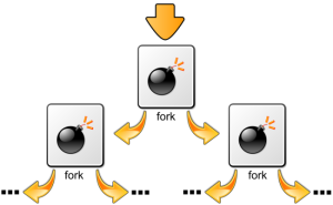 این دستور عجیب مثل یک دستور به نظـر نمی آید و عملکرد آن مثل یک ویروس می باشد که بی وقفه از خود رونوشـت تهیه می کند ، در سرانجام به عنوان Fork Bomb شناخته شده می باشد. این تابع shell سریع همـه منابع سیستم تان مثل CPU، حافظه و غیره را می رباید و در سرانجام شانس دارد باعث از دست رفتن اطلاعات شود. پس هیچوقت از این دستور و یا هر دستور عجیب و همانـند دیگری بهره گیری نمایید .