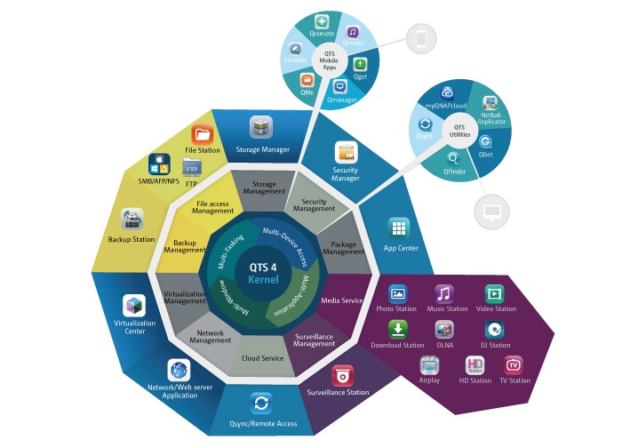 سیستم عامل QTS متعلق به کمپانـی QNAP و تهیـه شـده بر پایه لینوکس اسـت . QTS Turbo NAS سیستم عاملی اسـت که توانایی بهینه سازی با عملکرد بالا در ذخیره سازی فایل ها ، مدیریت ، پشتیبان گیری ، برنامه های کاربردی و چند رسانه ای و نظارت و زیـادتر را دارا اسـت که میتوان از رابط گرافیکـی فوق العاده راحـت برای مدیریت QTS ، توانایی مالتی تسکینگ ، بهره گیری از برنامه های کاربردی ، لذت بردن از سیستم چند رسانه ای ، نصب خیلی نرم افزار در درون خود QTS اشاره نمـود . جدای از این ، توانایی برنامه های کاربردی آن با خصوصیات ی زیاد وجود دارد که میتوان به پشتیبان گیری ، مجازی سازی ، به اشتراک گذاری فایل ها ، ISCSI و …. بطور اثر گذار بهره گیری کرد . و ضمناً میتوان از سیستم های ابری یا Cloud های فردی یا عمومی ، برنامه های تلفن هوشمند و همگام سازی داده ها از پلت ساختـار QTS بهره گیری کرد .