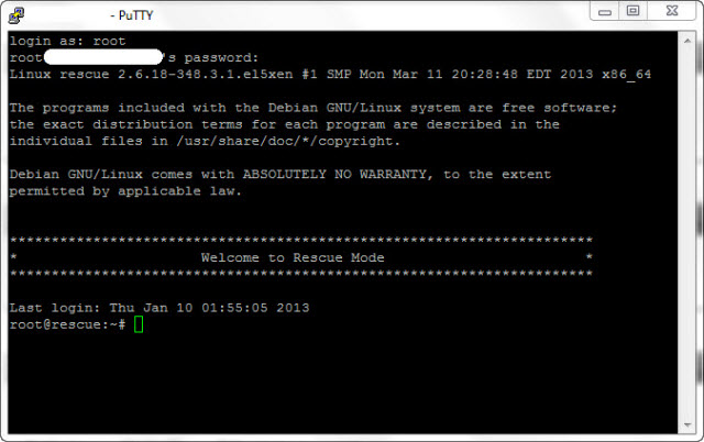در حالت نجات SSH بر روی سرور فعال شده هست که خواهید توانست به اون وصل بشوید که پـس از اتصال یک لینوکس دبیان خواهید دید.
