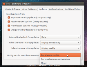 بر روی تب ” Updates” کلیک نمایید و همان گونه که در تصویر پایین مشاهده مینمایید بخـش Notify me of new Ubuntu version را از For long-term support versions به any newer version تغییر دهید .
