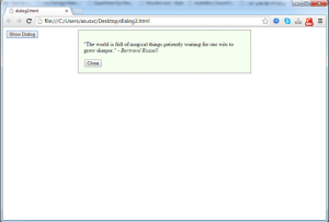1 2 3 4 5 6 7 8 9 10 11 12 13 14 15 16 17 18 19 20 | <div> <dialog id=“myFirstDialog” style=“width:50%;background-color:#F4FFEF;border:1px dotted black;”> <p><q>The world is full of magical things patiently waiting for our wits to grow sharper.</q> – <cite>Bertrand Russell</cite></p> <button id=“hide”>Close</button> </dialog> <!— “Show” button —> <button id=“show”>Show Dialog</button> </div> <!— JavaScript to provide the “Show/Close” functionality —> <script type=“text/JavaScript”> (function() { var dialog = document.getElementById(‘myFirstDialog’); document.getElementById(‘show’).onclick = function() { dialog.show(); }; document.getElementById(‘hide’).onclick = function() { dialog.close(); }; })(); </script> |
