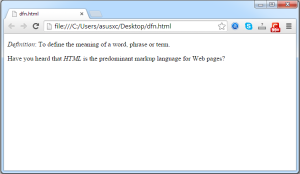 1 2 3 4 5 6 7 | <!DOCTYPE html> <html> <body> <p><dfn>Definition</dfn>: To define the meaning of a word, phrase or term.</p> <p>Have you heard that <dfn><abbr title=“HyperText Markup Language”>HTML</abbr></dfn> is the predominant markup language for Web pages?</p> </body> </html> |